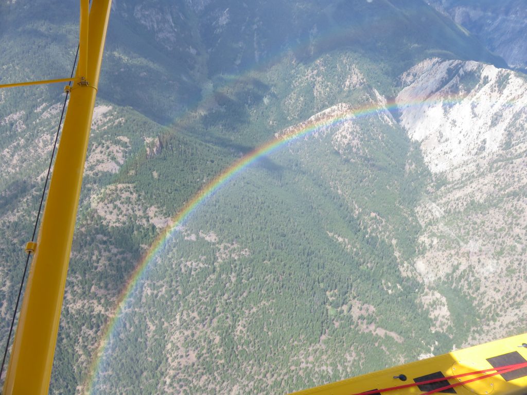 Rainbows occur when the sunlight is coming from behind you and when you’re flying that means that rainbows are beneath you when you fly through the rain and get a shot of sunlight. As I passed the Lillooet Airport I had enough cell tower strength that I gave Julie a call with my phone plugged into the intercom system. It was fun to have a chat with her and share that I still really did not know if I would make it to Victoria that night, but if not, I would probably make it the next night.