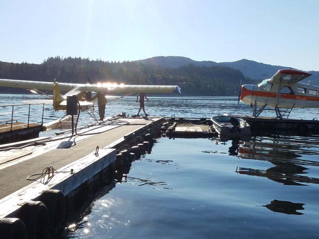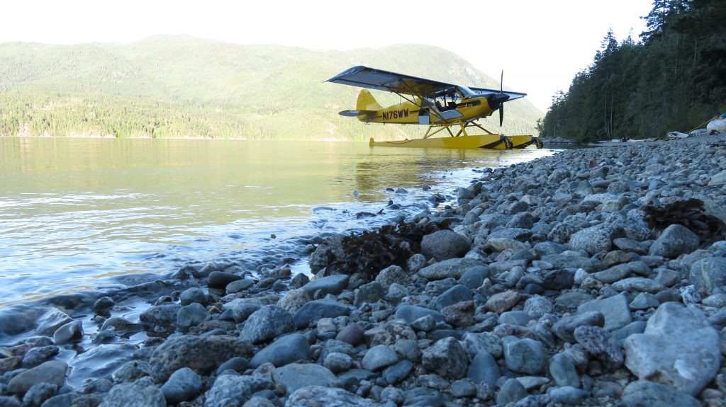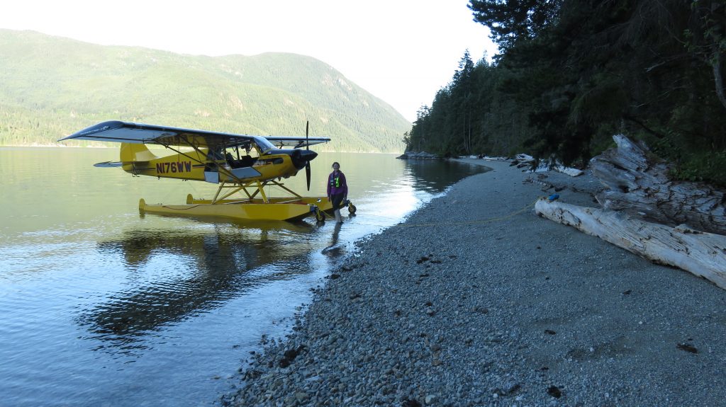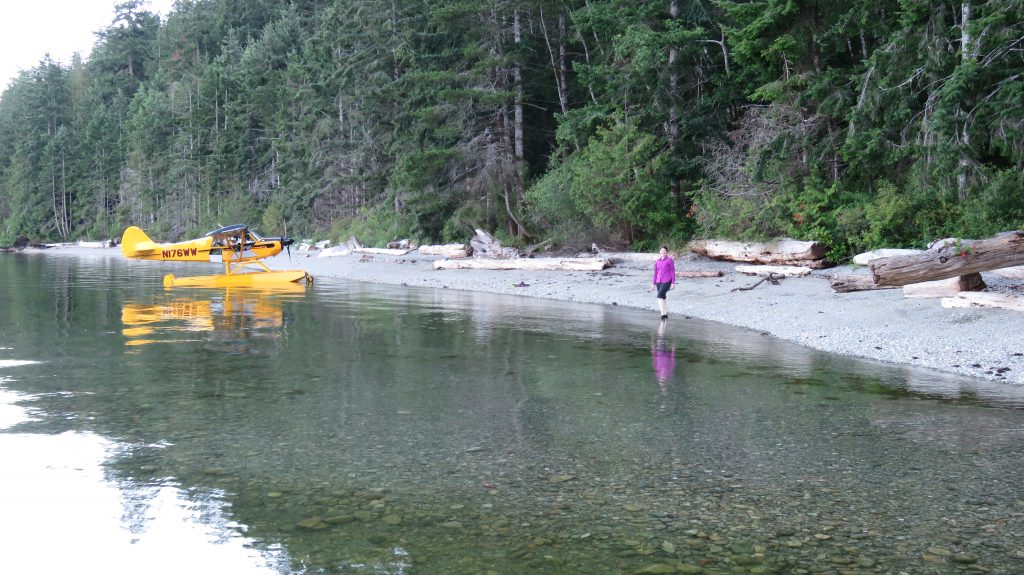 We decided to go South to Sechelt where they had an airstrip that sells fuel. When I put the landing gear selector down, three of the wheels came down for landing but one did not move. The pump was still running and trying to put it down but that wheel was still up in the float. I tried once more to move the switch up and back down but that wheel still would not extend. I could have tried hand pumping it down but it seemed like I probably had an oil leak and I chose to leave the gear up and land in the water by town where I had seen some other float planes docked. First just in open water I looked for leaks and tried it again but it did not work so we taxied over and docked by the other float planes. The dock attendant was very helpful but he was about to leave for the day and we would be stuck there because I did not feel comfortable with our fuel quantity for flying back to the resort and then somewhere else to get fuel. We decided not to troubleshoot anymore and his boss said he had to get cash from us for any fuel because they are not set up to sell fuel. He drove me to the ATM and then we put about an hour’s worth of fuel in. I was thinking it must be the piston seal leaking in the cylinder that extends that wheel and that I would be leaving the wheels up only landing on water all the way back to Sonoma County! I decided to try and pumping the gear just in case that gave me some new information and sure enough it did. I found that the emergency hand pump selector lever (on the floor by my right heel) was in the up position and not in the neutral position where it needs to be for the electric pump to work right. I was sure I must have moved it with my foot by accident but when I pointed it out to Julie she said that when I told her to put the water rudders up with the black handle she saw that and moved it to the up position. She felt terrible, but I could totally see how she thought that’s what I was telling her to put in the up position, (two days before). We still had some time to kill before the current was supposed to reach its lowest point so we dropped into a beach along the way just for fun. It was a beautiful spot and we waited around the shallow water picking up souvenir rocks and looking at the little baby crabs.