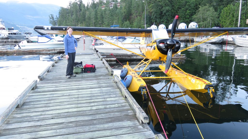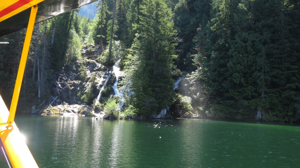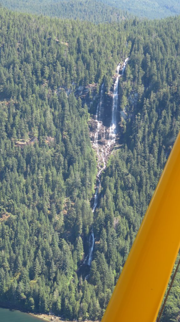 Right as we finished that video we noticed what seemed like large boat wake swells coming up on shore. It was wind swells being generated from the strong winds farther down the lake we knew that if those winds got to us in that position the plane would probably be pushed into the trees and rocks so we jumped on the plane and drove it offshore dragging the anchor. The departure was fine, we had carefully memorized a path that did not have any logs so we just back taxied enough of it that we could confirm nothing new blew into our way. At the far end of the lake on take off there was definitely rough air and very strong winds but we did not have a problem getting out into the main inlet. We then flew back past the marina and around Harmony Island Marine Provincial Park looking for bears or wolves along the shoreline. We did not see any but there is a beautiful waterfall, Frey Lake Falls that comes down the cliff there.