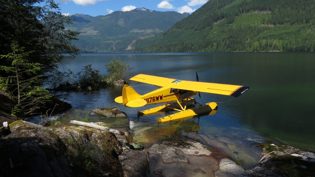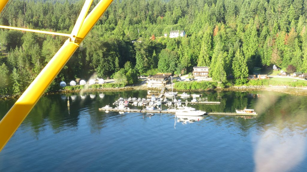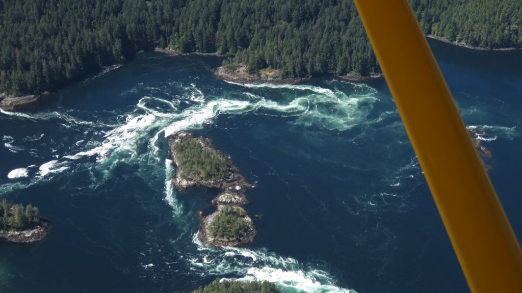 We then headed about 10 miles West to Powell River airport for gas. I taxied up to the pumps and a guy came out and informed us that the airport had not had fuel for 7 years. We chatted with him for a while and he was about to take his Cessna 180 that is on amphibs also out flying so we tagged along with him and over the radio he gave us a tour and pointers of Powell Lake and some of the other lakes around there. We then then enjoyed flying across some other mountain Lake sightseeing and again over the Skookumchuck Narrows that is just South of the marina. It has a crazy amount of tidal water that goes back and forth through it with the tides. It creates big standing waves and rapids that is popular for surfers but has caused many deaths including a coast guard boat and a big tug boat flipping over.