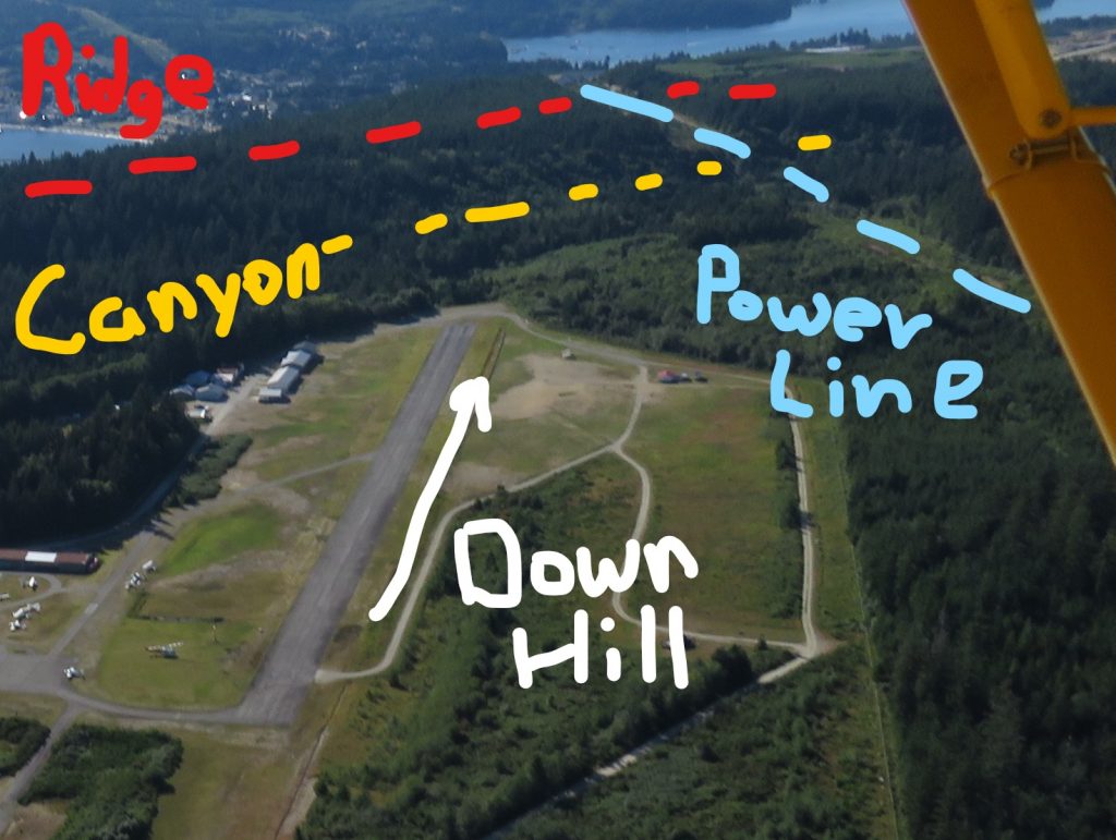We headed down to Sechelt to get some gas. I noticed on departure that even though the runway to the West is desirable because it is down sloping, off the end of it there is a large canyon and then a tree covered ridge that is above the departure end of the runway and it has a large set of power lines on the right that would prevent you from turning and following the Canyon to the right. The Husky did not have a problem climbing over the ridge, but I could feel the downdraft as we went over the canyon and I certainly did not like the departure situation.