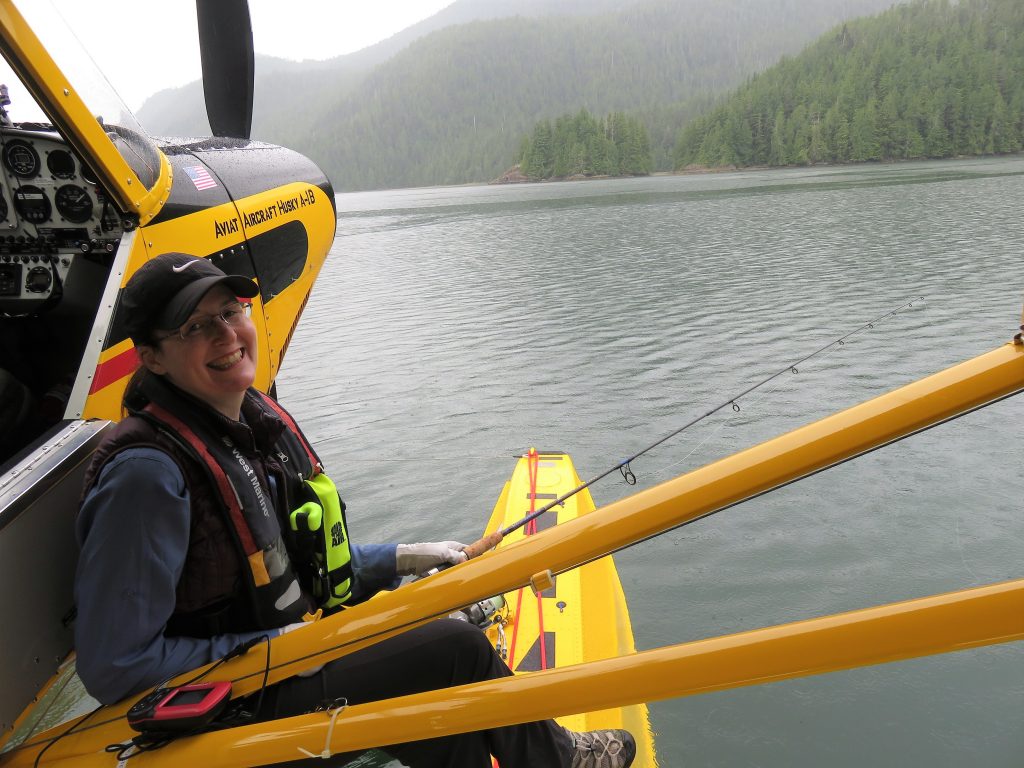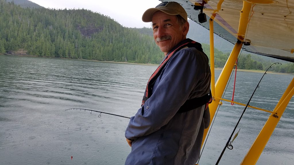 We then flew down to the mouth of the fjord because we were told that the salmon were biting down there. When we landed a small powerboat came out from a logging operation to check on us and when we said we were looking to fish he offered up the dock that they have anchored out from their operation. It was really fun too tie up and fish off the dock in the shade of the wing.