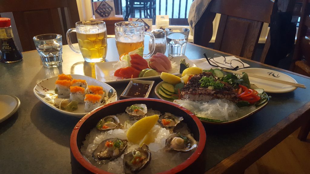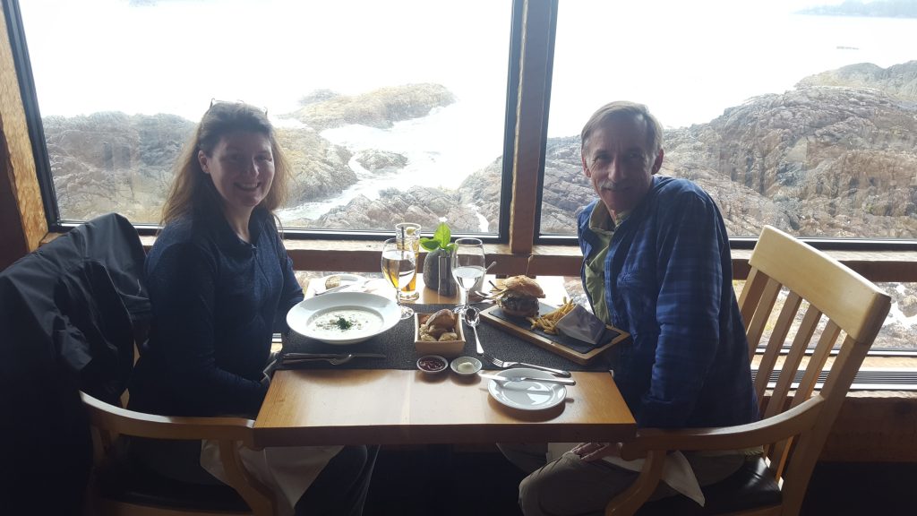 At the airport we were chatting with the car rental lady and mentioned that we were looking to go halibut fishing but did not have anything scheduled yet. She texted a friend of hers that does charters. He texted back that he was available tomorrow. She spoke very highly of him and through some texting we made an appointment to meet him at the dock at the South end of the peninsula in Ucluelet at 6:30 the next morning. We checked into our air B&B house. Then we went into town and had a late lunch at the Schooner Restaurant. It felt wonderful to be out on the patio enjoying the blue skies and ocean air. Julie had a oyster combination plate and then we shared a brie stuffed halibut fillet dish that was incredible.