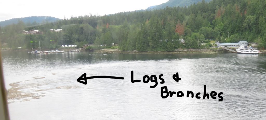 We had reservations for 3 nights at the West Coast Wilderness Lodge. I had spent months trying to arrange for a safe parking spot at the marina next door to the lodge and finally had settled for a marginal docking spot. The Back Eddy Marina is known for ferocious currents coming through the dock area. Boats have been pushed sideways and smashed and logs and floating stumps have come through the dock area and badly damaged large boats. I spent a lot of time studying the tide and current charts for the area and had a specific time that I thought it would be safest to arrive and tie up to the dock.